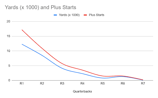 Therefore, the Draft Codex tries to strike a balance without overloading the available information. By reporting quarterbacks’ total passing yards and number of games played, it gives a sense of the quarterbacks’ longevity and total contributions. By contrast, by reporting what percentage of their starts are at or above roughly “league average” level (90) for their career, it gives a sense of what level of performance they put forward during that career. Finally, by including the number/rate of high-level games (100+), it helps pull out the high performers.