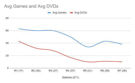 Safeties attract the fewest picks of any defensive position (only 21 picks a year). Along with corners, they create fewer disruptive plays than the other defensive positions, which makes sense–the defensive backs are doing their job when they are discouraging plays, not stopping them. Unlike many other positions, more safeties become regular starters than reliable contributors, which is possibly explained by the injury rate among defensive backs making it unlikely these players are healthy for 60+ games per five-year span.